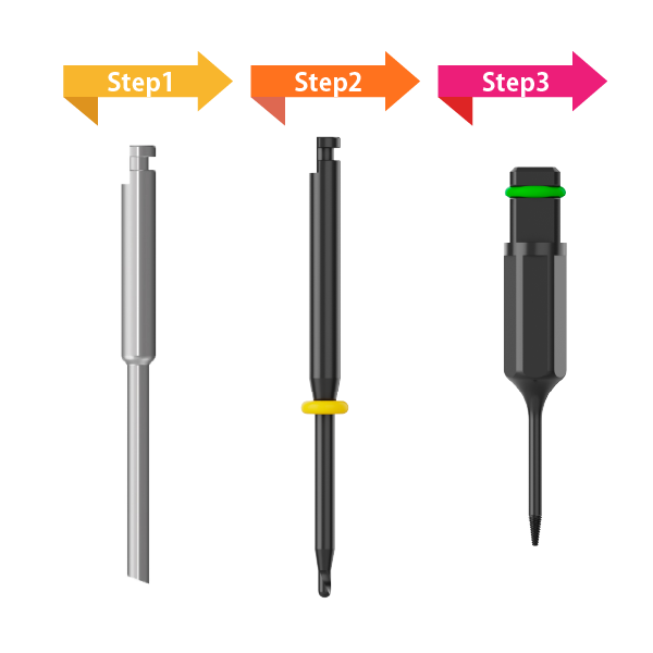 Screw Tapping Driverを使用します。Step2で形成した形成孔に対してScrew Tapping Driverを嵌入しトルクをかけることで除去します。その際も付属のガイドを用いて形成孔に対して垂直になるようにしてください。